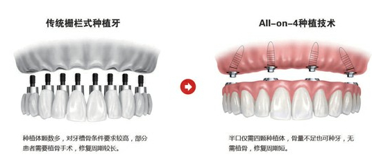 “All-on-4”全口种植牙是一种针对半口或全口牙种植的修复方案,用极少的种植体实现使用功能,仅需每个单颌种植四个种植体即可支撑半口的牙桥。植入种植体后即刻安装固定牙桥,通常无需植骨,克服了传统种植牙槽骨不足无法种植的缺陷。